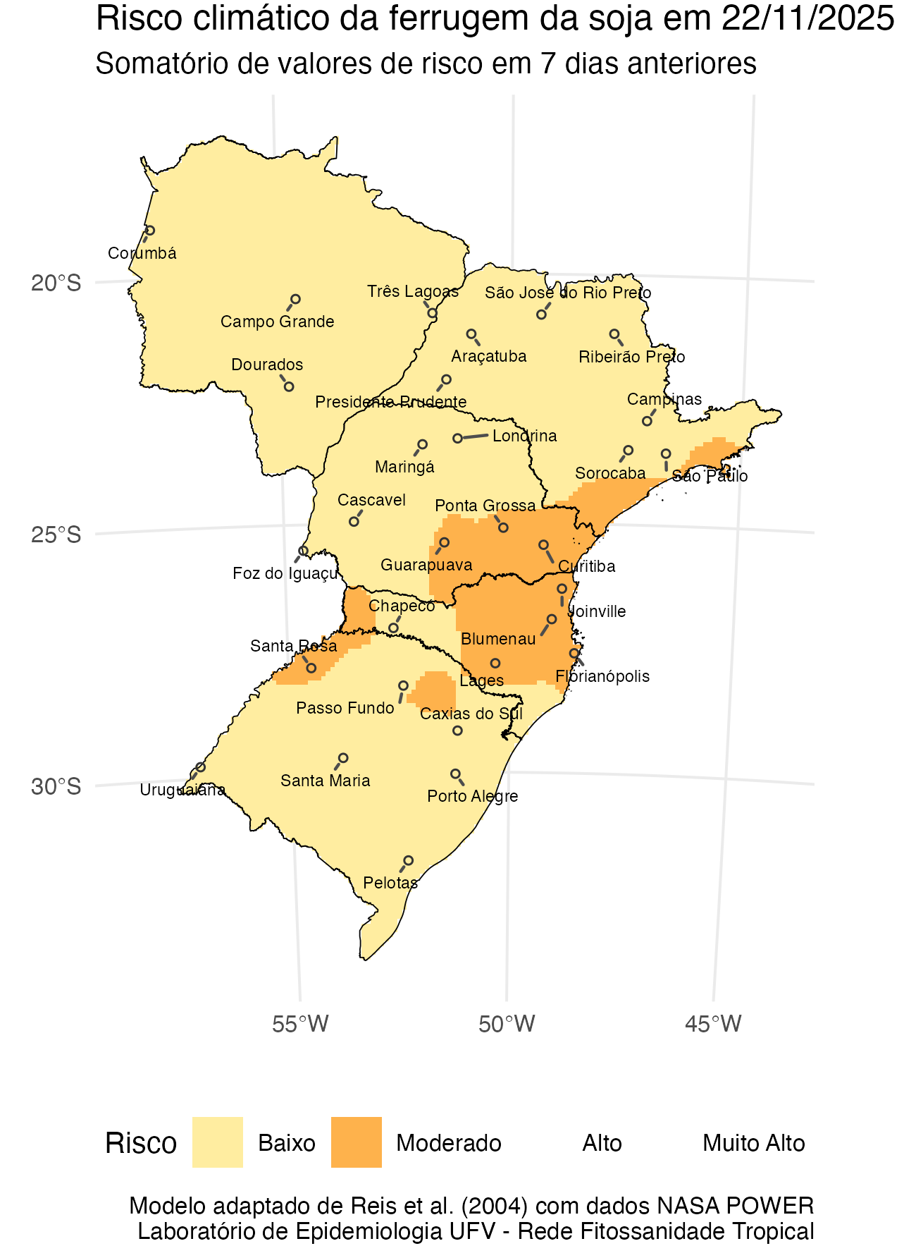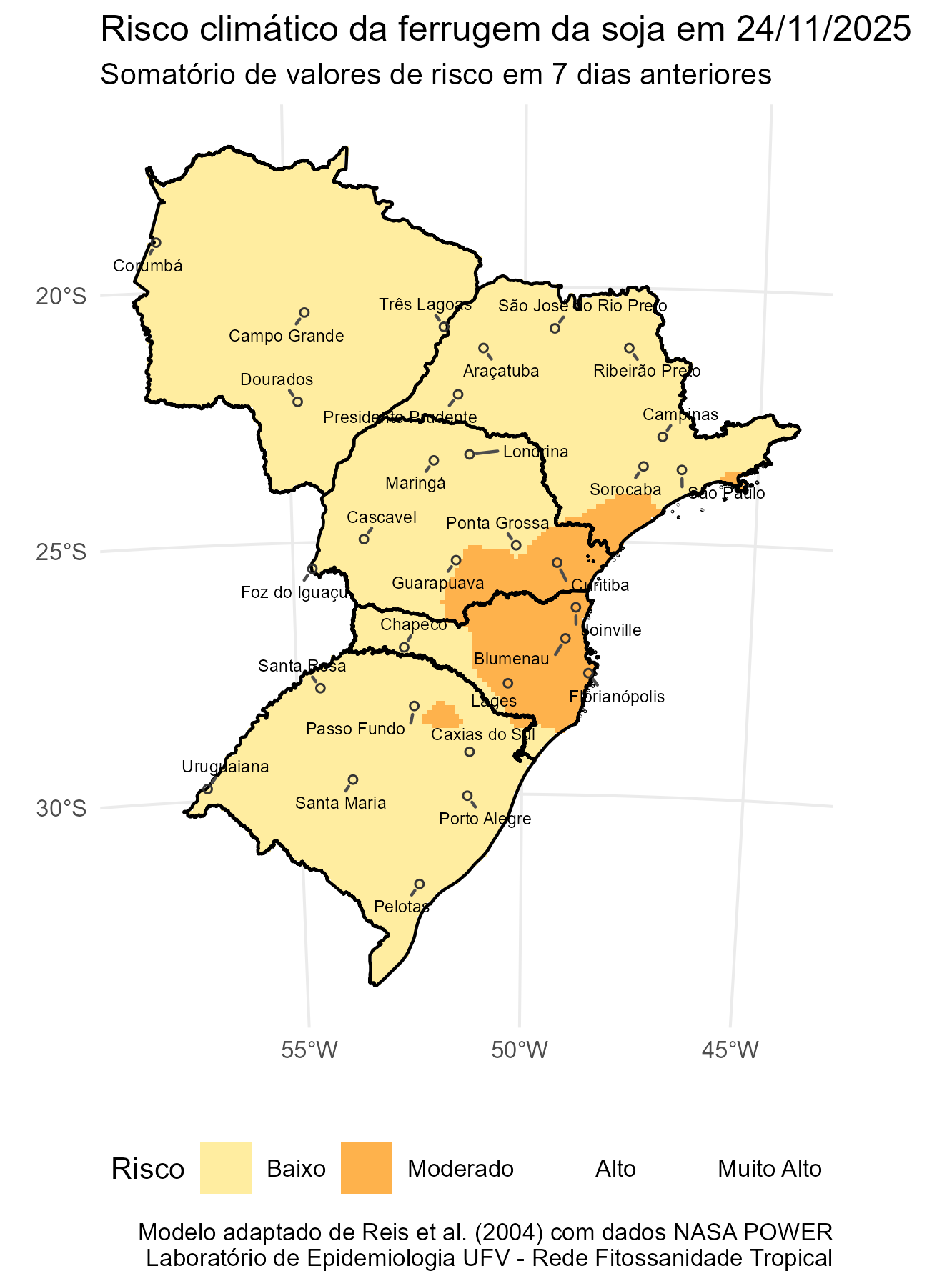 A partir da safra 2025/26, o Laboratório de Epidemiologia da UFV, em parceria com a Rede Fitossanidade Tropical, estará gerando mapas de risco da ferrugem da soja considerando as áreas Centro Sul do Brasil (RS, SC, PR, MS e SP) onde a doença ocorre de maneira mais frequente.